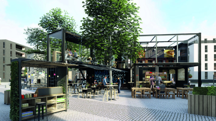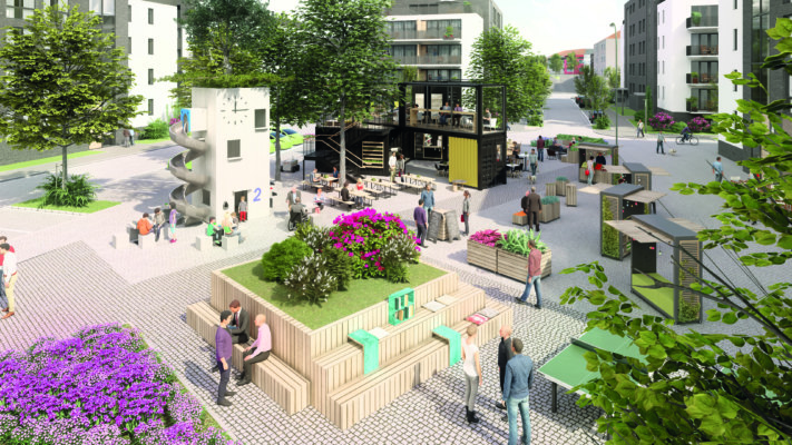 Angedockt sind hier auch die E-Bike und die Car-Sharing-Flotten, Ladestationen für E-Mobility sowie die Paketstation – alle Services buchbar per APP.Die mobilen Stände auf dem Marktplatz sind multifunktional und vielfältig nutzbar. Ein kleiner regionaler Wochenmarkt mit frischen Produkten findet hier ebenso statt wie der monatliche Kreativitäts- und Flohmarkt und das Frühlingsfest.