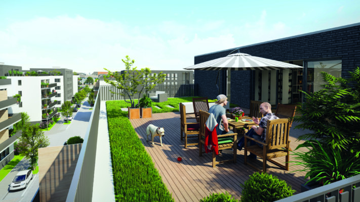 Alle Gebäude haben begrünte Dächer, und den oberen Geschossen sind Dachterrassen zugeordnet, grüne Oasen, ideal, um die Freizeit zu genießen oder entspannt zu arbeiten.