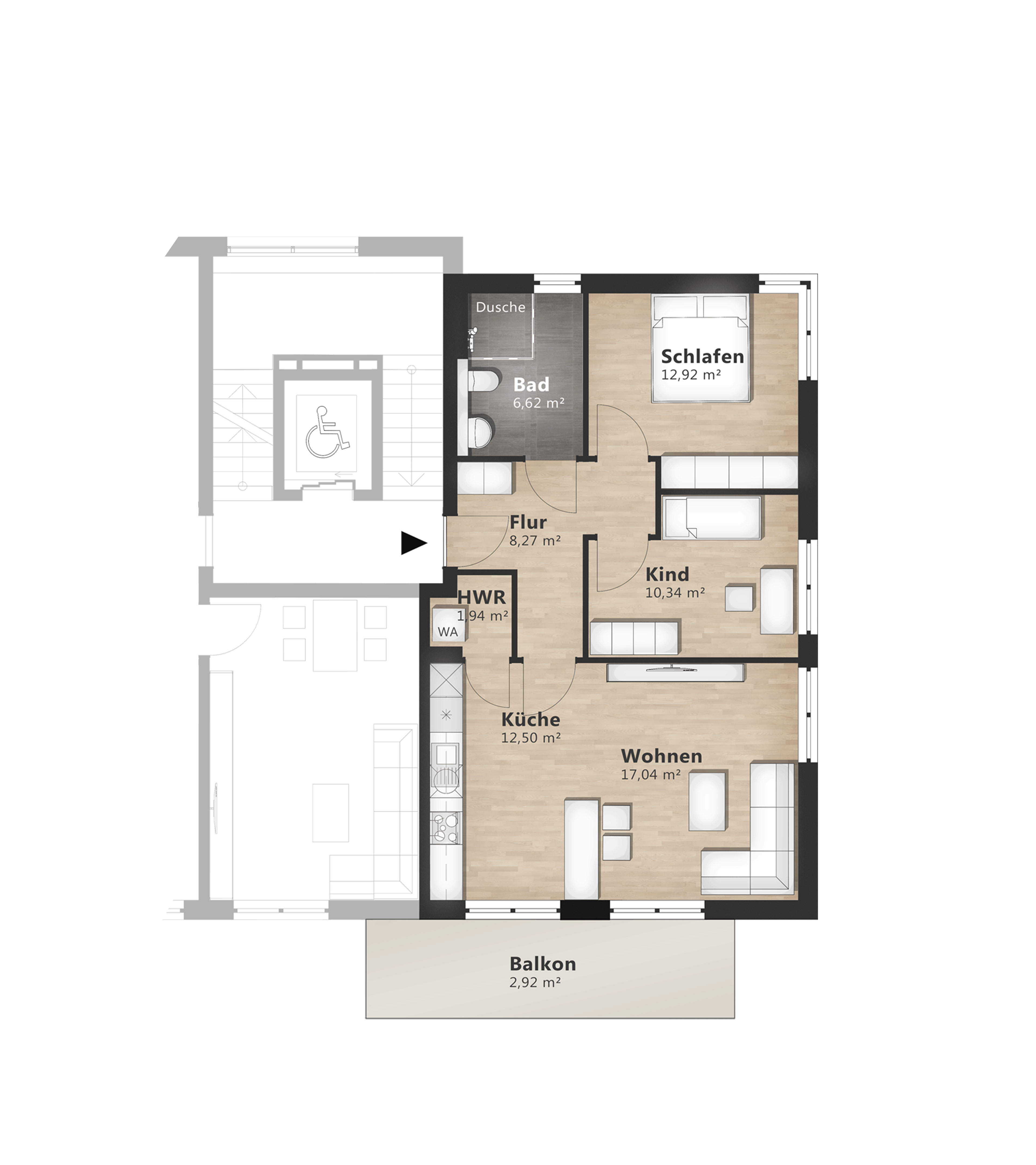A B Wohnen 17,04 m² Küche 12,50 m² Schlafen 12,92 m² Kind 10,34 m² Bad 6,62 m² Flur 8,27 m² HWR 1,94 m² Balkon 2,92 m² Gesamt 72,55 m² 4-Zimmer-Wohnung
