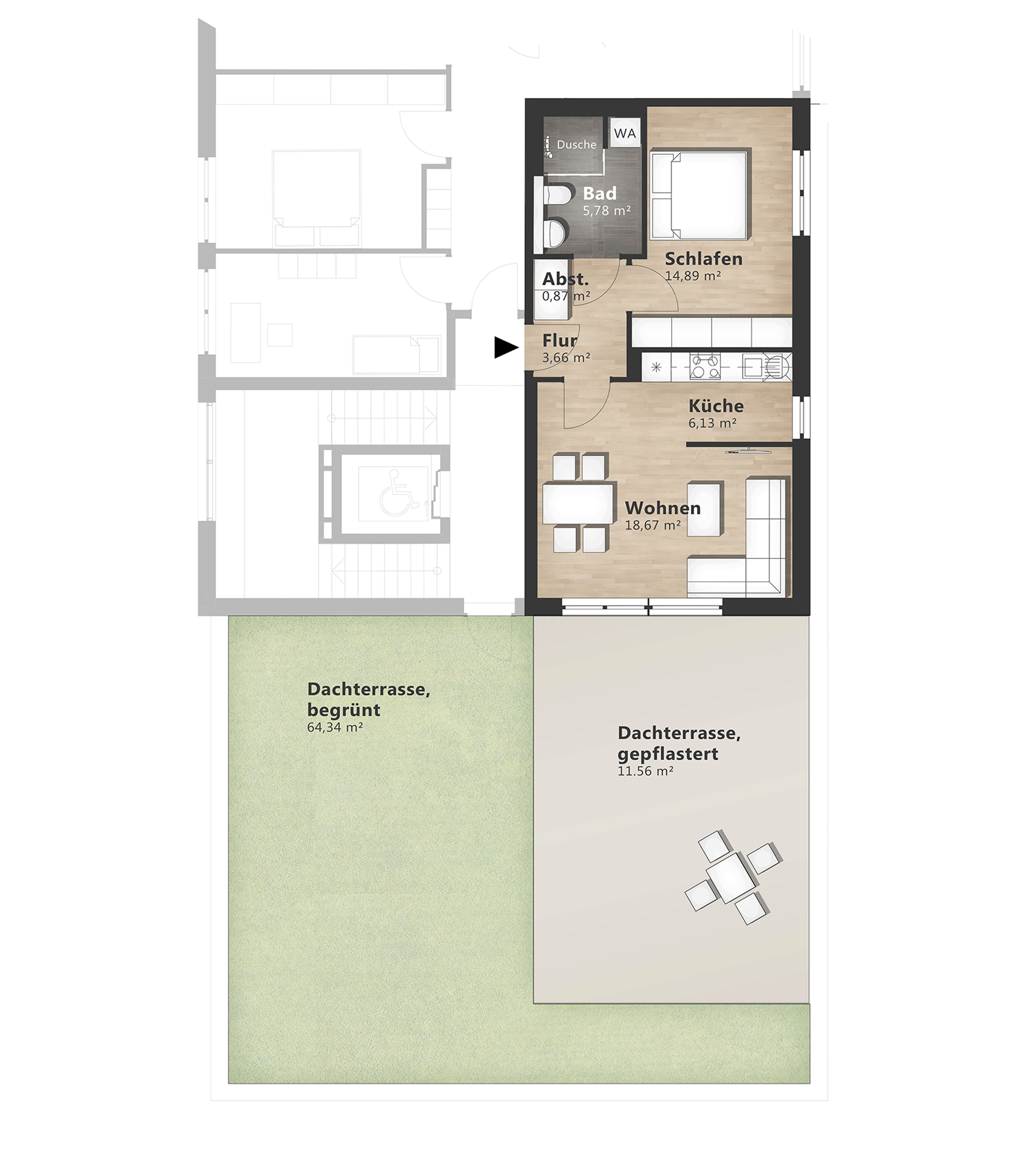A B Wohnen 18,67 m² Küche 6,13 m² Schlafen 14,89 m² Bad 5,78 m² Flur 3,66 m² Abstellraum 0,87 m² Dachterrasse 11,56 m² Gesamt 61,56 m² 3-Zimmer-Wohnung