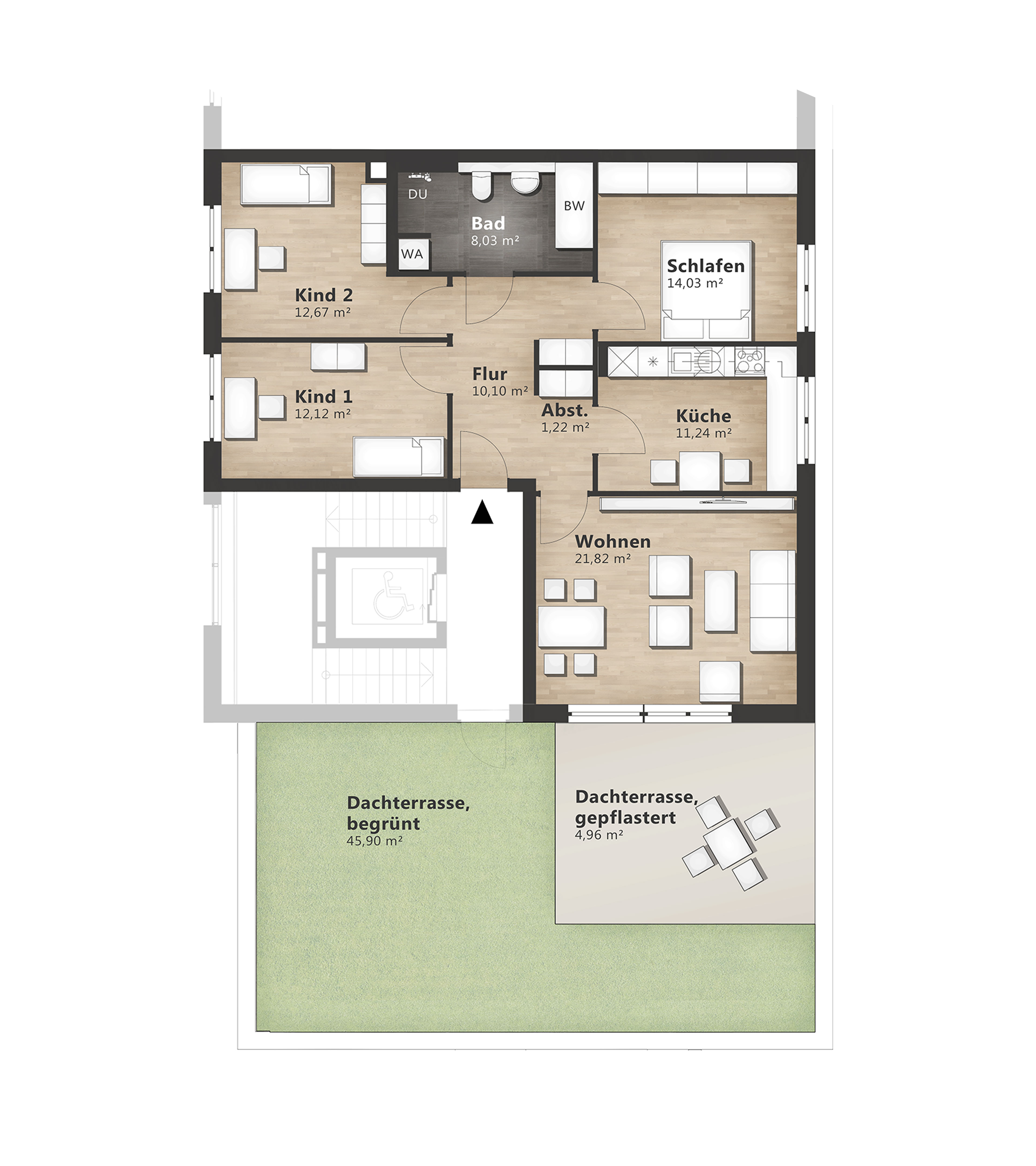 A B Wohnen 21,82 m² Küche 11,24m² Schlafen 14,03 m² Kind 1 12,12 m² Kind 2 12,67 m² Bad 8,03 m² Flur 10,10 m² Abstellraum 1,22 m² Dachterrasse 4,96 m² Gesamt 96,19 m² Spielen 2.0